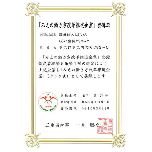 当院は、職員の働きやすさを重視した取り組みが認められ、「みえ働き方改革推進企業」に認定されました。